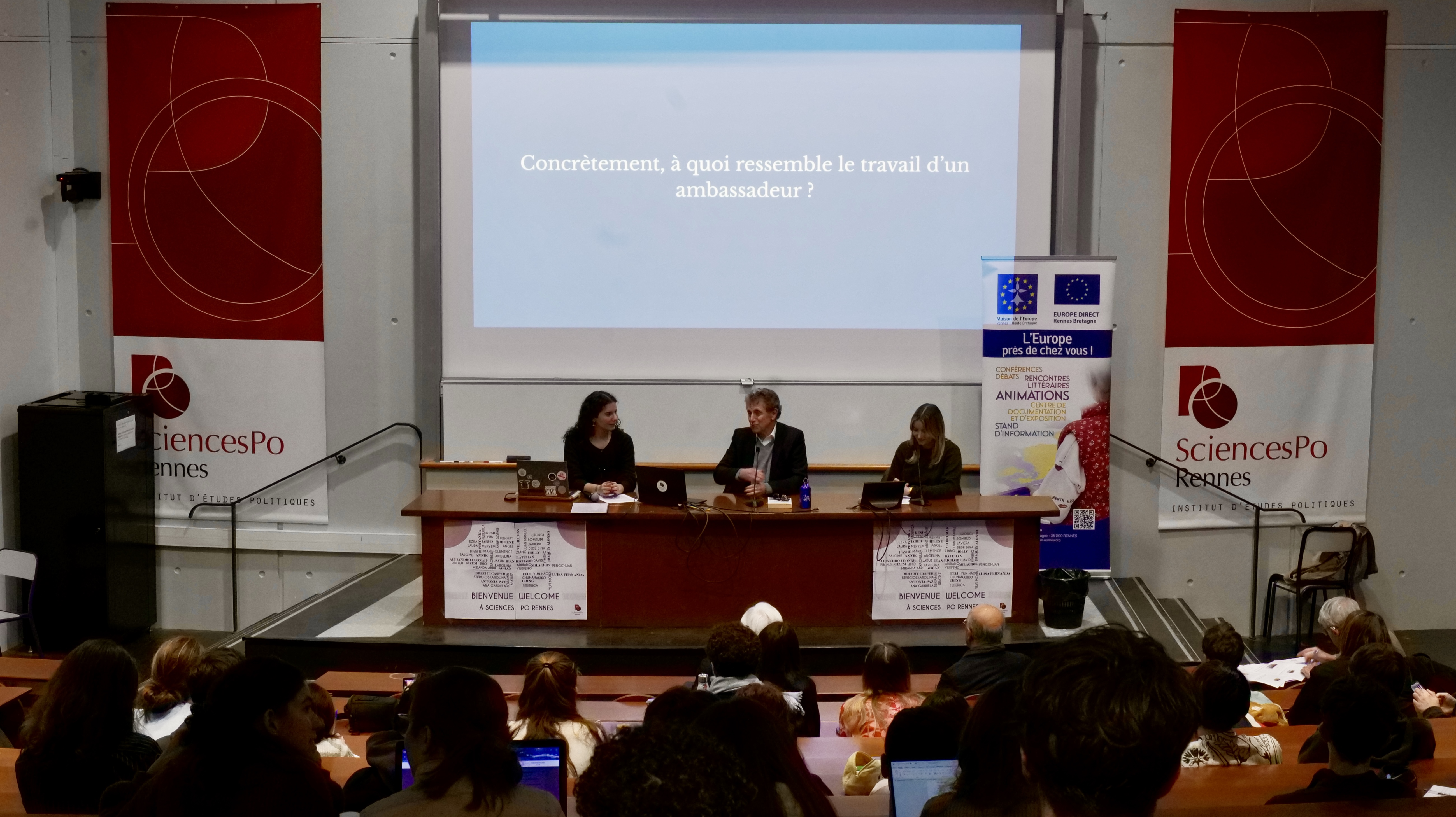 L’ancien diplomate a d’abord présenté le travail d’un ambassadeur, évoquant notamment son rôle central de représentation de l’État français à l’étranger. L’ambassadeur est chargé de promouvoir la France dans tous les domaines, tant sur le plan culturel, que militaire, économique et universitaire par exemple. Il effectue également des missions d’analyse, de communication dans les médias et assure avec son équipe et le consulat la protection des ressortissants français dans son ou ses pays d’attributions.