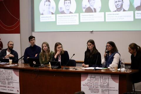 La seconde a regroupéFlorence Razan, responsable de formation transition à l’ENS, Hélène Muscat, directrice de l’IPAG de Rennes, Tanguy Descamps, enseignant-coordinateur de la formation sur la transition écologique et sociale à l'université de Rennes, Julien Brunier, directeur de projet transition écologique à l’EHESP et Margot Simon, étudiante de l’IPAG. La table ronde était animée par Amandine Chollet et Clara Jourdan, élèves à l’ENS.