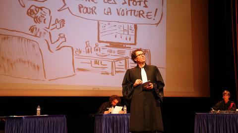 Cet événement participatif reprenant la scénographie d’un procès, vise à échanger sur la mobilité de demain. Les protagonistes ont ainsi débattu sur la thématique suivante : « Une ville désirable est-elle une ville sans voiture ? ». Pour appuyer leurs propos, ils ont appelé à la barre trois experts : Anne Faure (présidente de l’association Rue de l’Avenir), Jean-Marc Offner (Directeur scientifique de 6t-Bureau de recherche) et Laurence de Nervaux (Directrice chez Destin Commun). Un jury composé de 4 étudiants, représentant chacune des écoles partenaires, a ensuite rendu sa décision.