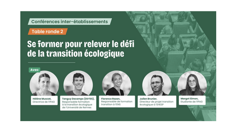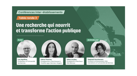 Au programme : trois tables rondes pour mieux comprendre le rôle de l'action publique, de la formation et de la recherche dans la transition écologique, en présence de chercheurs, d'experts et d'étudiants.