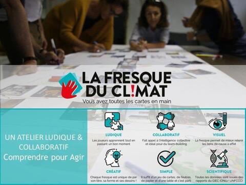 D’une durée de 3h, cet atelier ludique conduit par un animateur ou une animatrice met en pratique l’intelligence collective et permet de comprendre les mécanismes du changement climatique au moyen d’un jeu de 42 cartes dont les liens de causes à effets sont à retrouver par les participants et participantes.