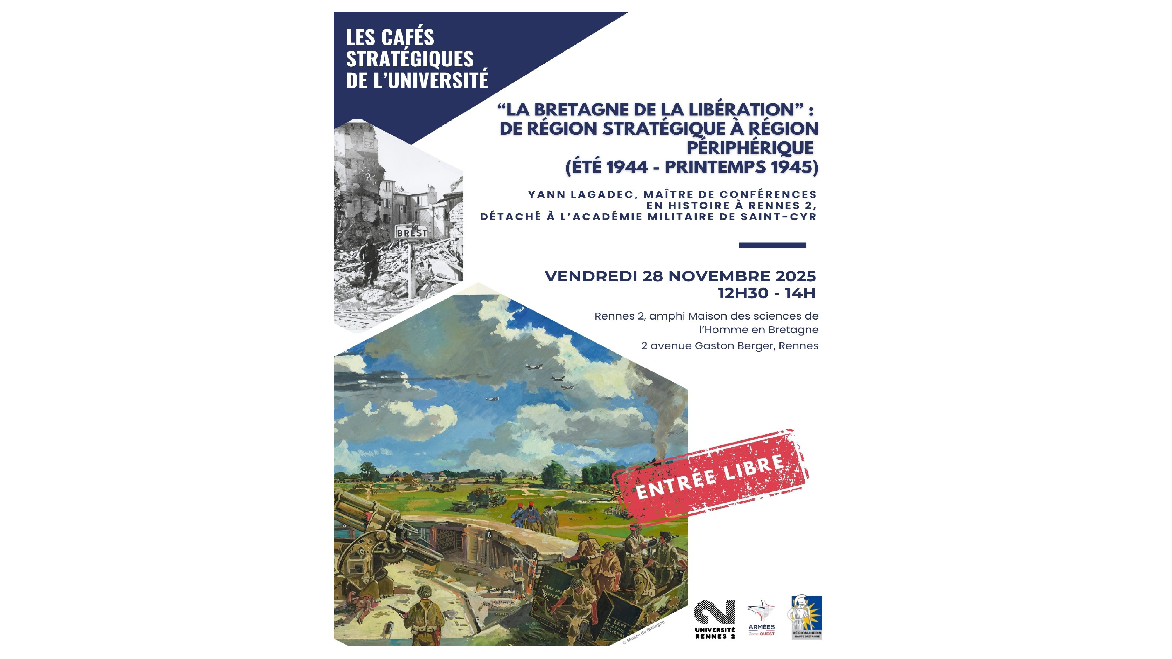 Le prochain café stratégique se tiendra le 28 novembre 2025 de 12h30 à 14h00 sur le thème de "La Bretagne de la libération". Cet évènement animé par Mr Yann Lagadec, maître de conférence en histoire moderne à Rennes 2 et détaché à l'Académie militaire de Saint-Cyr Coëtquidan.