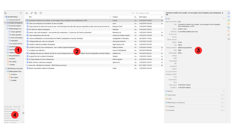 L'interface de Zotero se présente en 4 panneaux ou zones :