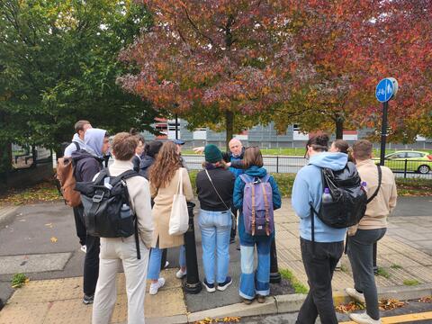 Un premier groupe a d’abord parcouru le quartier du savoir (Knowledge Quarter) des universités (Liverpool University et John Moores University) pour comprendre comment la présence des étudiants influe sur les dynamiques du quartier. Ils ont ensuite rejoint Darren Smith, professeur de géographie à l’université de Loughborough, spécialiste des questions de gentrification, qu’ils avaient rencontrés lors d’un premier cours au campus des transitions en septembre. Le professeur est venu partager son analyse de la studentification, un concept qui décrit les effets de la présence étudiante sur le reste de la population et les processus d’adaptation ou de conflits que celle-ci induit au sein des quartiers universitaires.